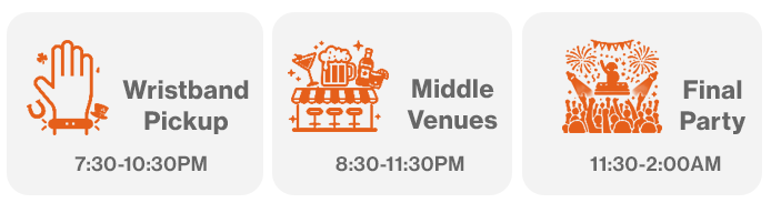 Pick up your wristband at the start venue 7:30–10:30 PM