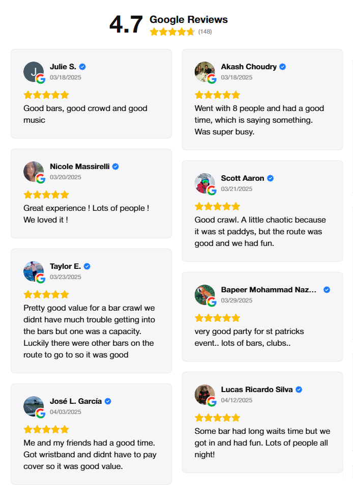 Past crawl energy. Expect packed rooms, music and a high-energy crowd.