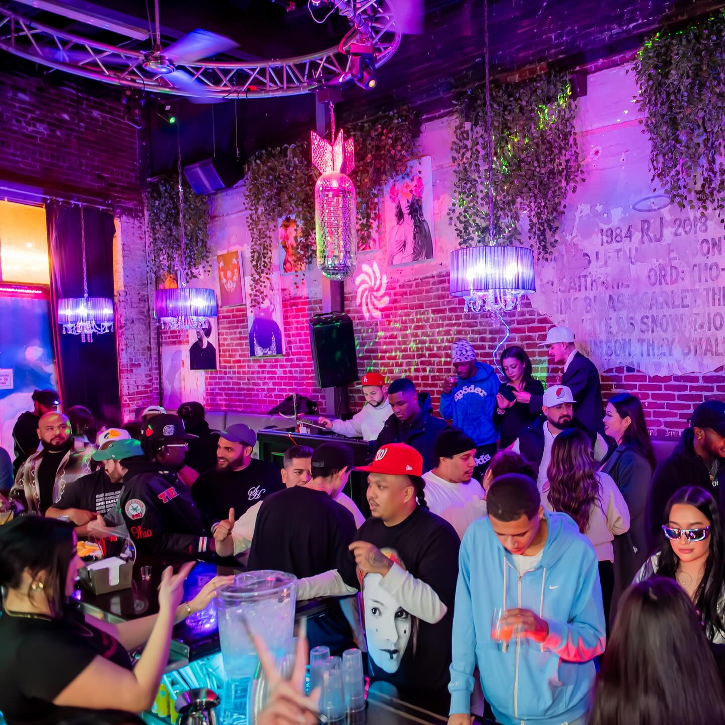 District is a nightclub that has a modern and stylish interior that creates a lively and fun atmosphere. The bar is lit up with glowing shelves of bottles and glasses, and the purple and neon lights make the space feel energetic. The seating includes high tables and soft chairs, surrounded by cool exposed brick walls. The layout is perfect for dancing and socializing. There’s also a neon sign that adds a playful vibe to the venue. The club even offers private bookings on certain nights, so it’s great for hosting events or celebrations.